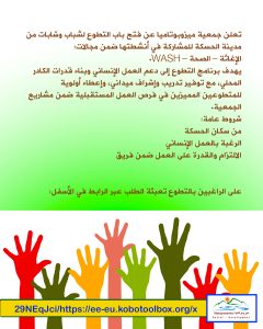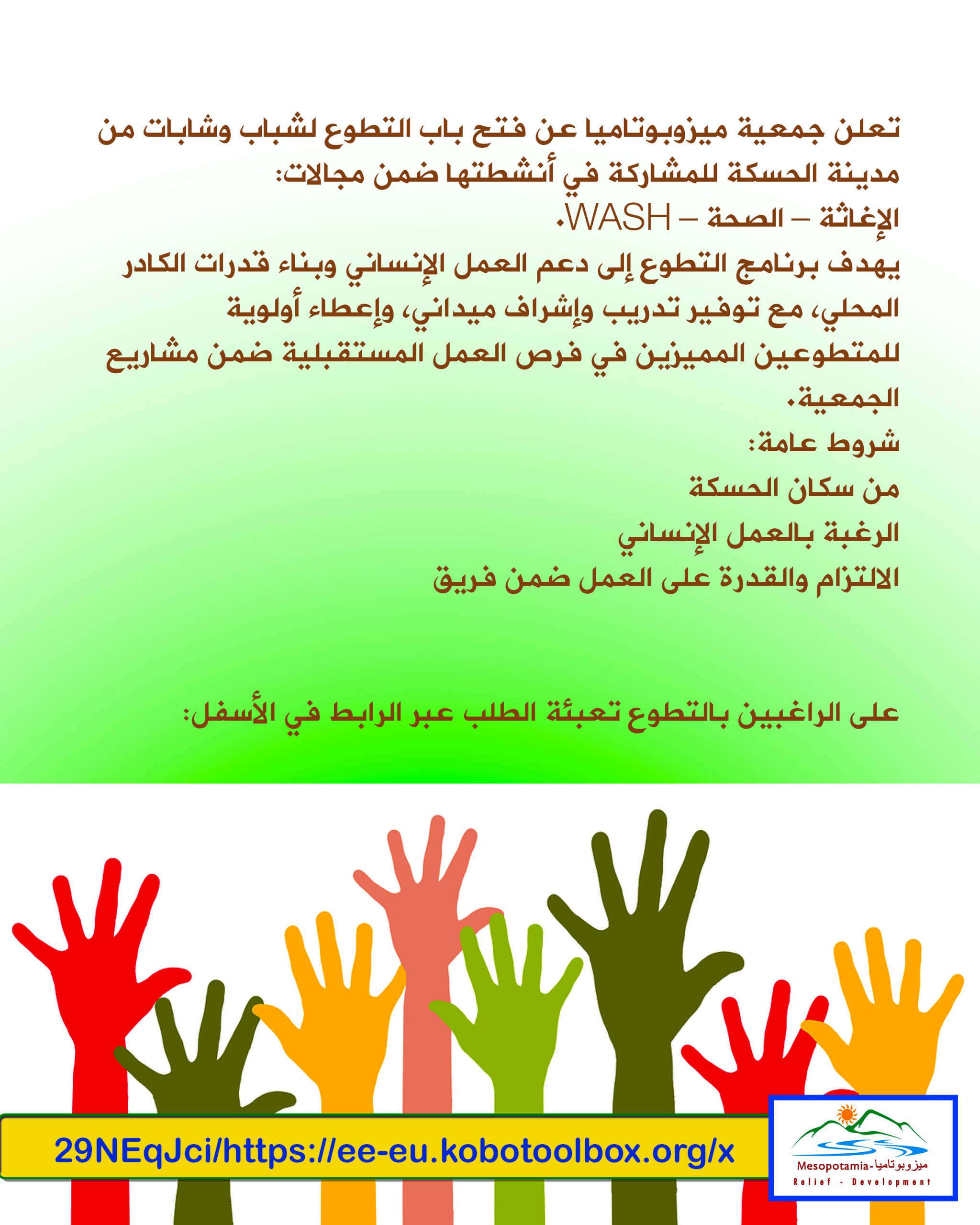 تعلن جمعية ميزوبوتاميا عن فتح باب التطوع لشباب وشابات من مدينة الحسكة للمشاركة في أنشطتها ضمن مجالات: